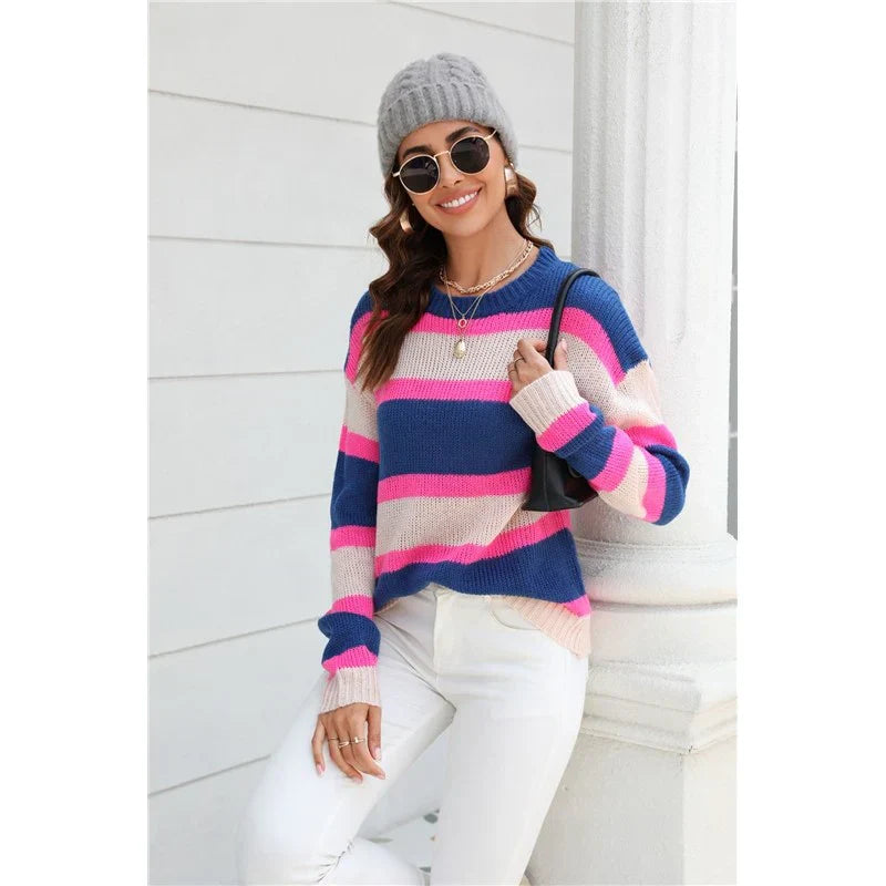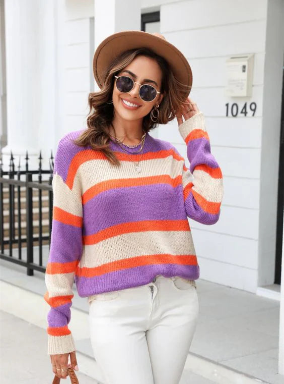 Der mehrfarbig gestreifte Pullover Viventia bringt lebendige Farben und modernen Stil in Ihre Garderobe. Mit seinem weichen Material und den fröhlichen Streifen eignet es sich perfekt für bequeme, trendige Looks an kühlen Tagen.
