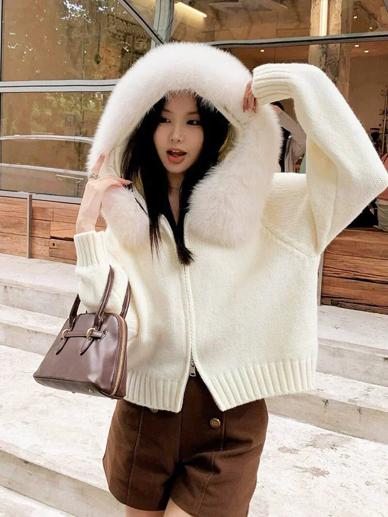 Damen strickjacke grau mit kapuze & kunstpelz – warme winterjacke
