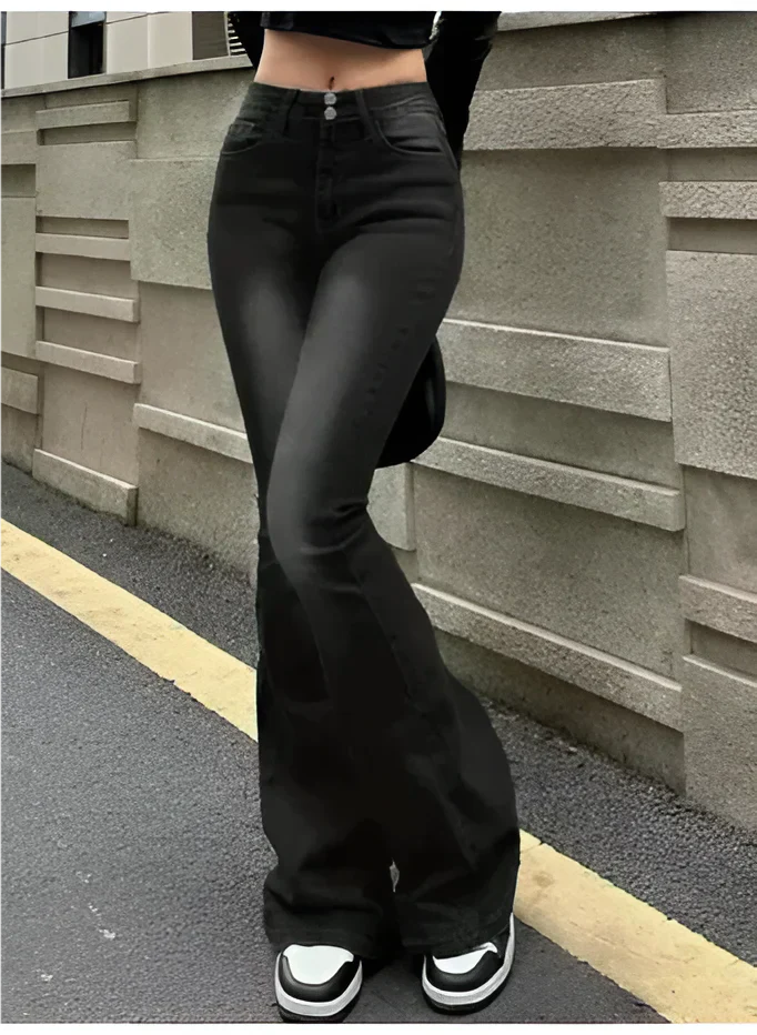 Hochgeschnittene, ausgestellte Slim-Fit-Jeans für Damen. Werten Sie Ihre Garderobe mit dieser hochgeschnittenen, ausgestellten Jeans auf , die für eine elegante Slim-Fit-Silhouette entworfen wurde . Sie ist schmeichelhaft und stilvoll, betont Ihre Kurven an Taille und Hüfte und verleiht Ihnen einen modernen, ausgestellten Look – perfekt für lässige Tage oder festliche Anlässe.